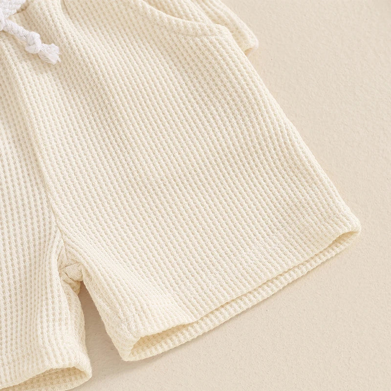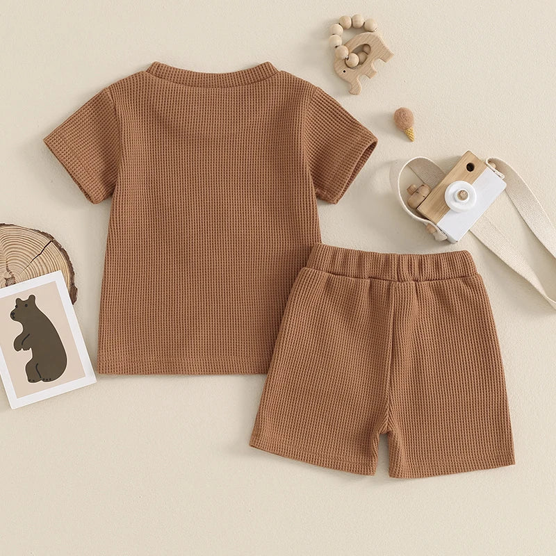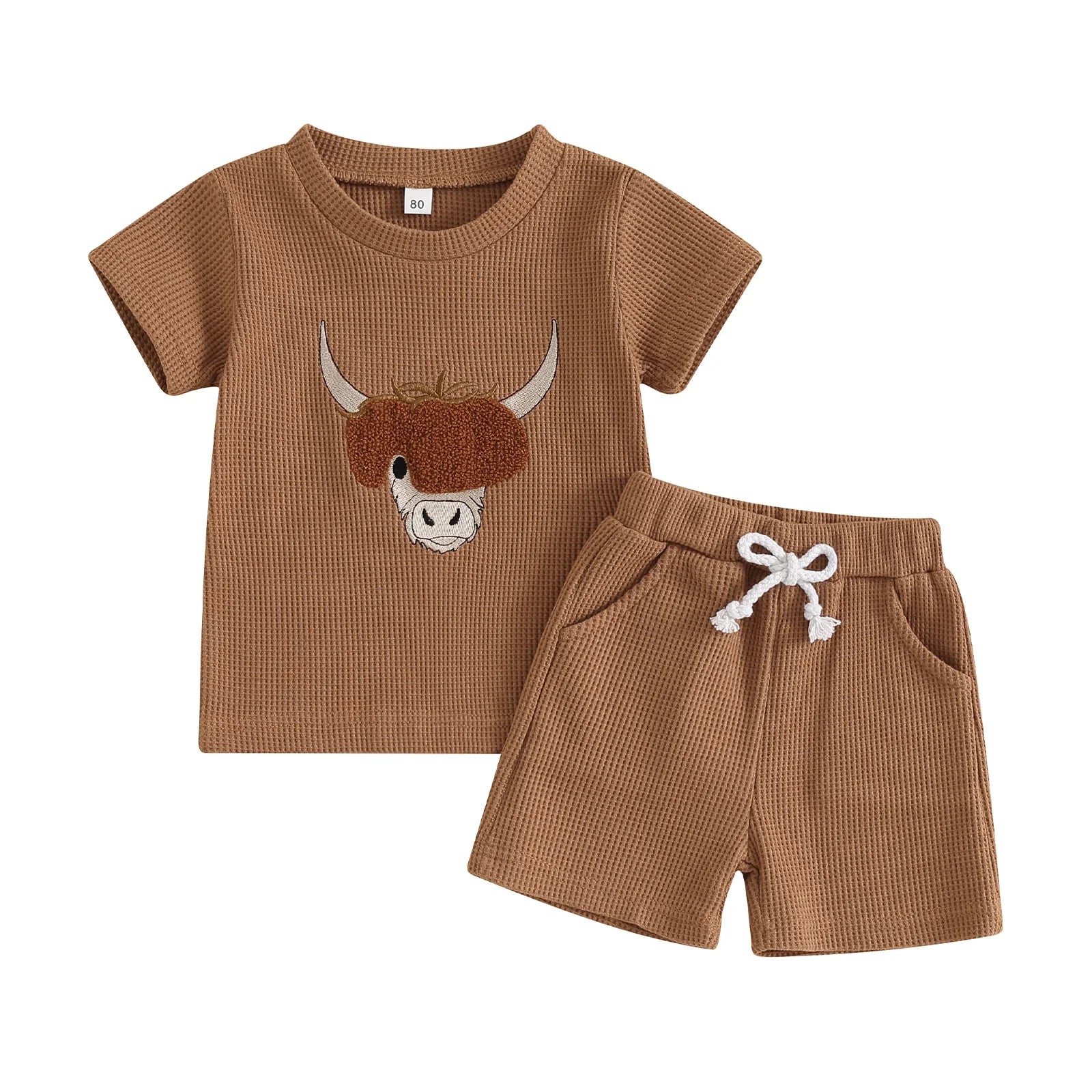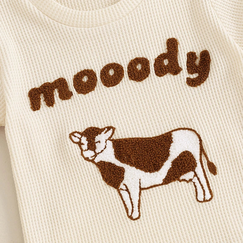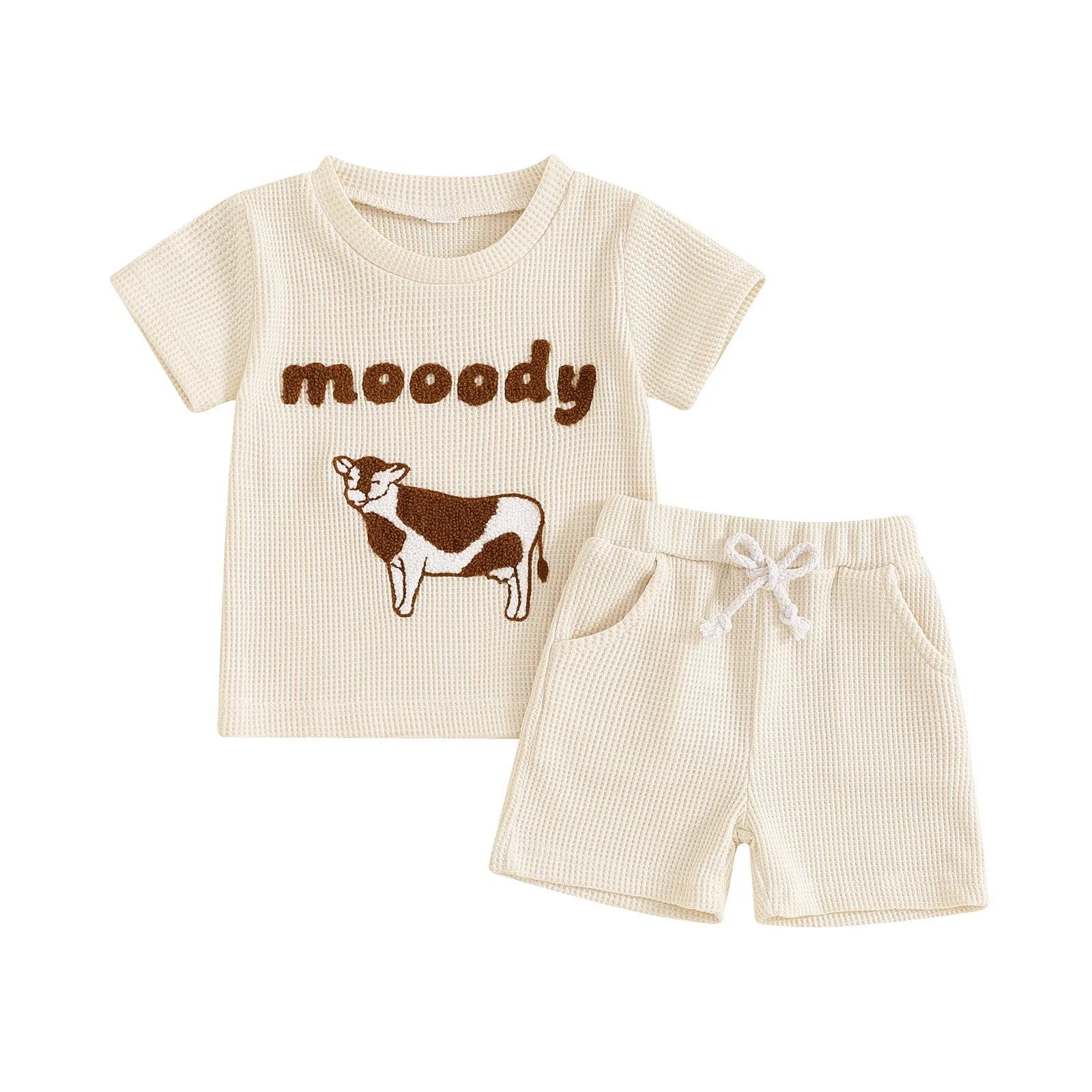 This set includes a plush Letter and Cow theme Embroidery Short Sleeve Waffle T-shirt, paired with elastic waist shorts adorned with a charming country theme.